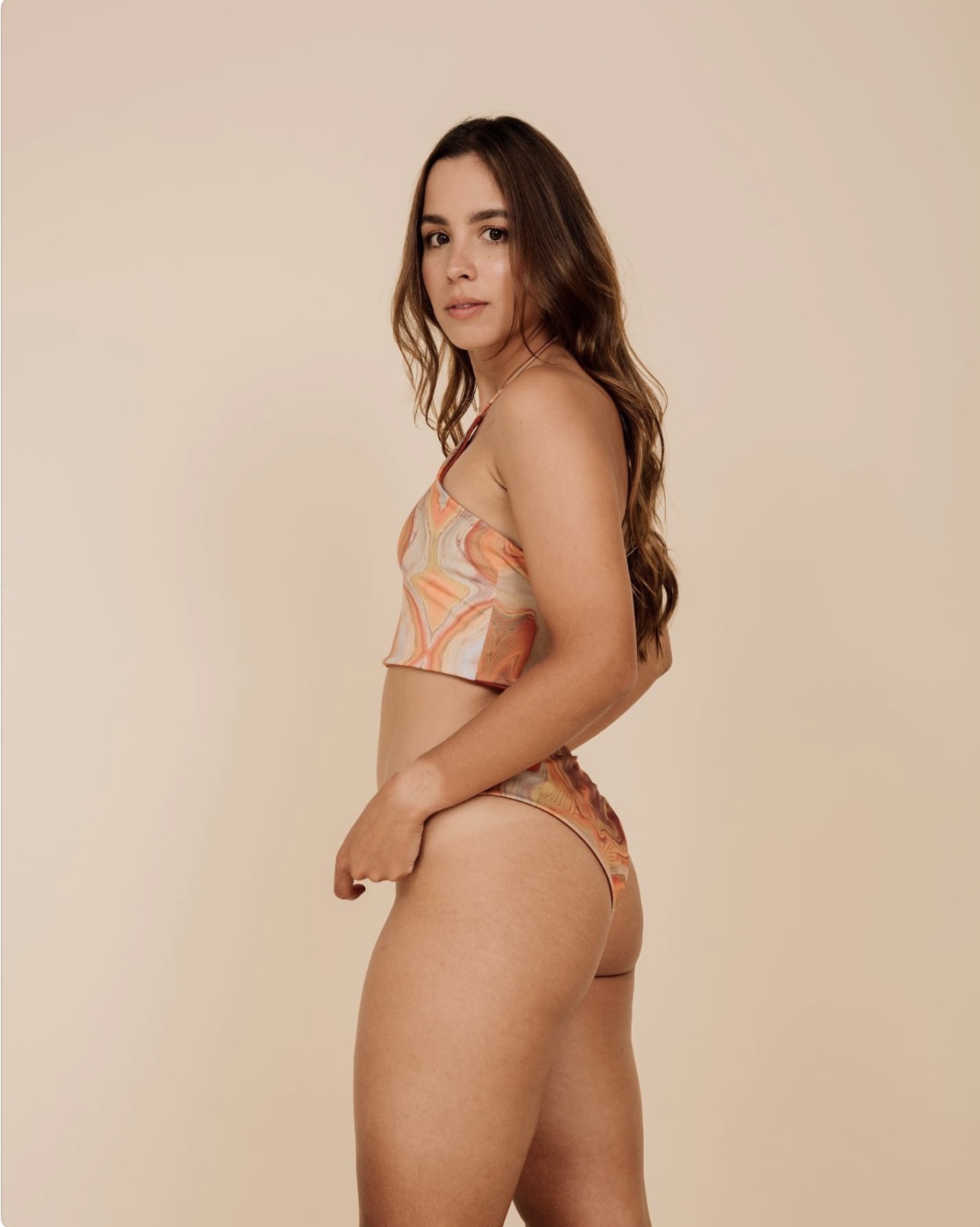 Bikini estampado con top halter y tanga. Elaborada con poliéster reciclado obtenido a partir de de botellas pet. Base de tejido de punto deliciosa al tacto. La tela es inteligente con protección solar UPF 30-50, filtro UV resistente al agua clorada y con sal.