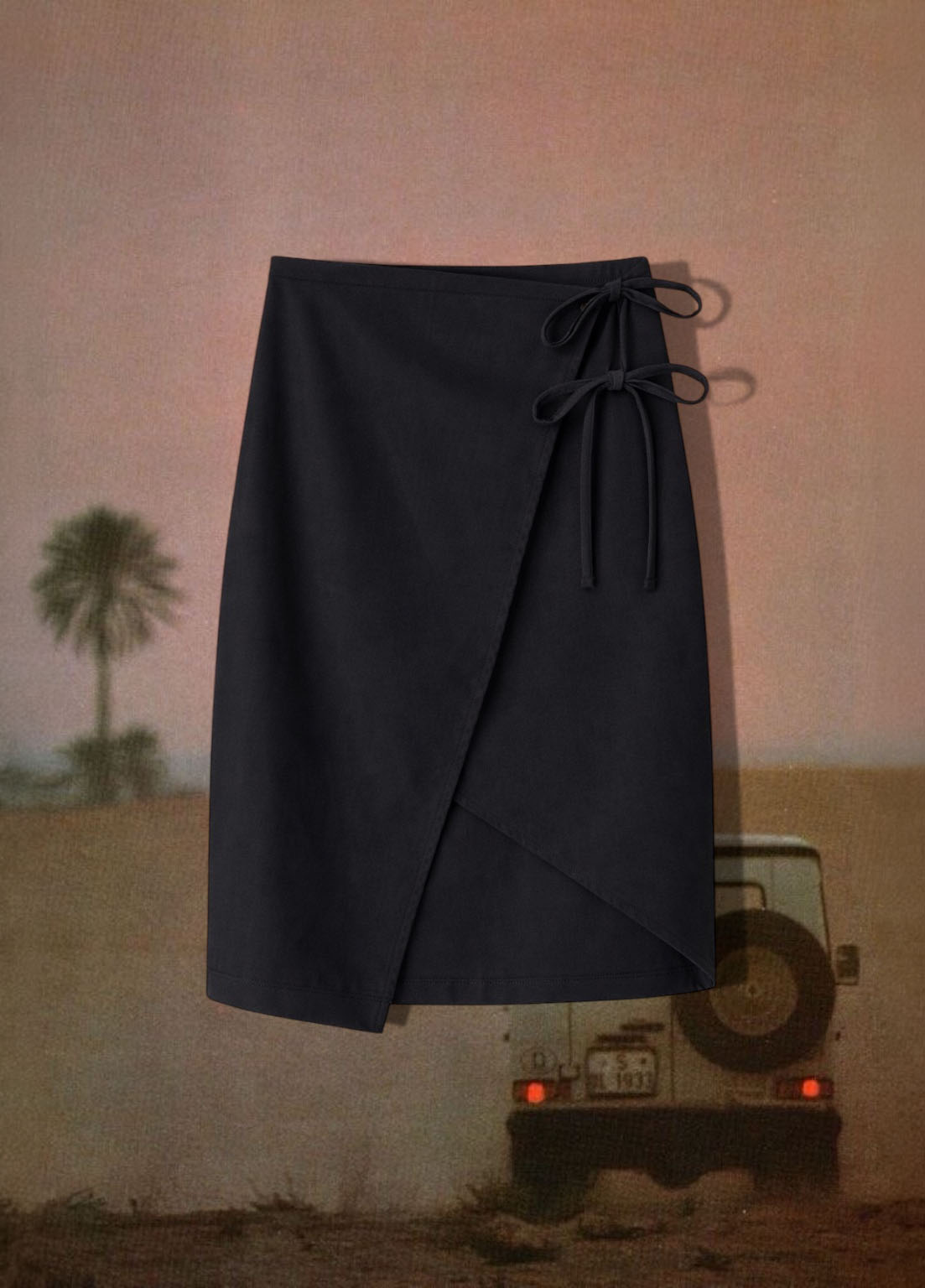Falda de lino tipo wrap, con lazo lateral y amarre co dos lazos.
