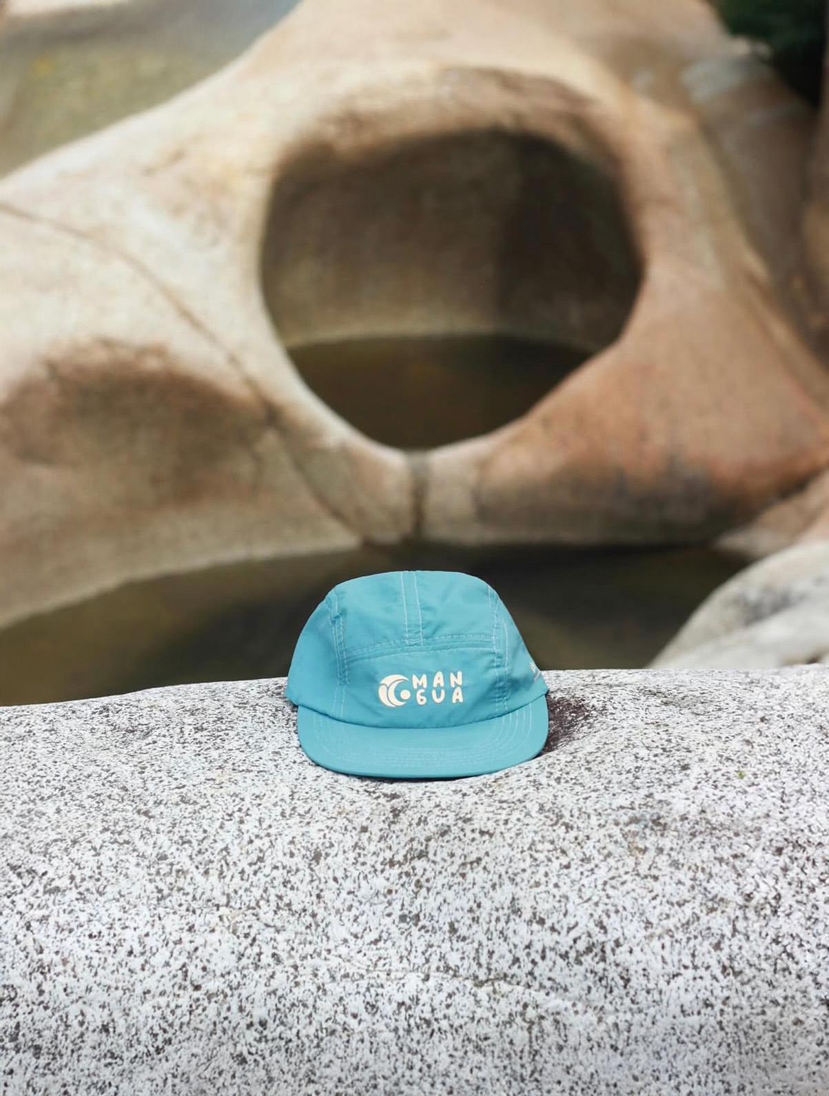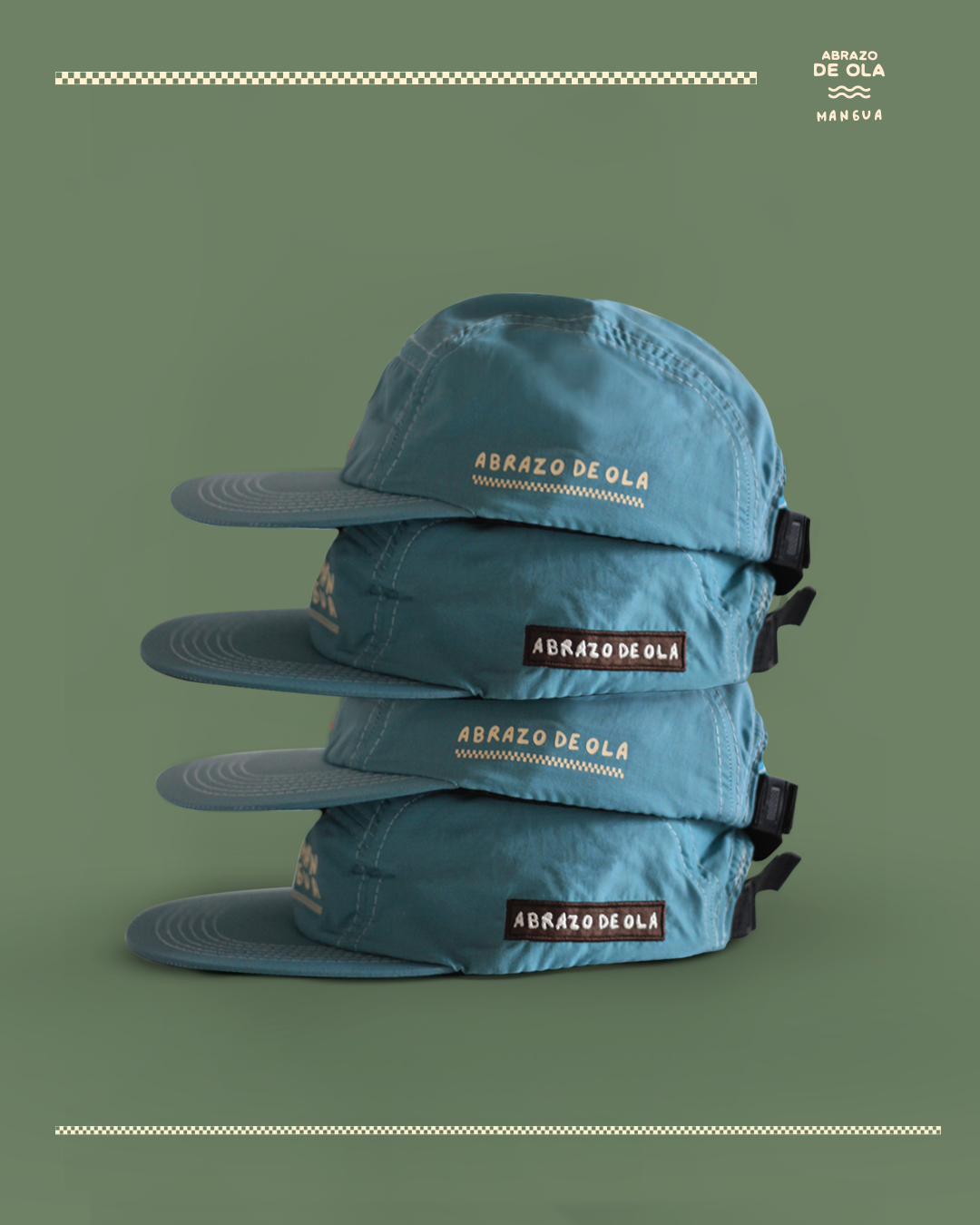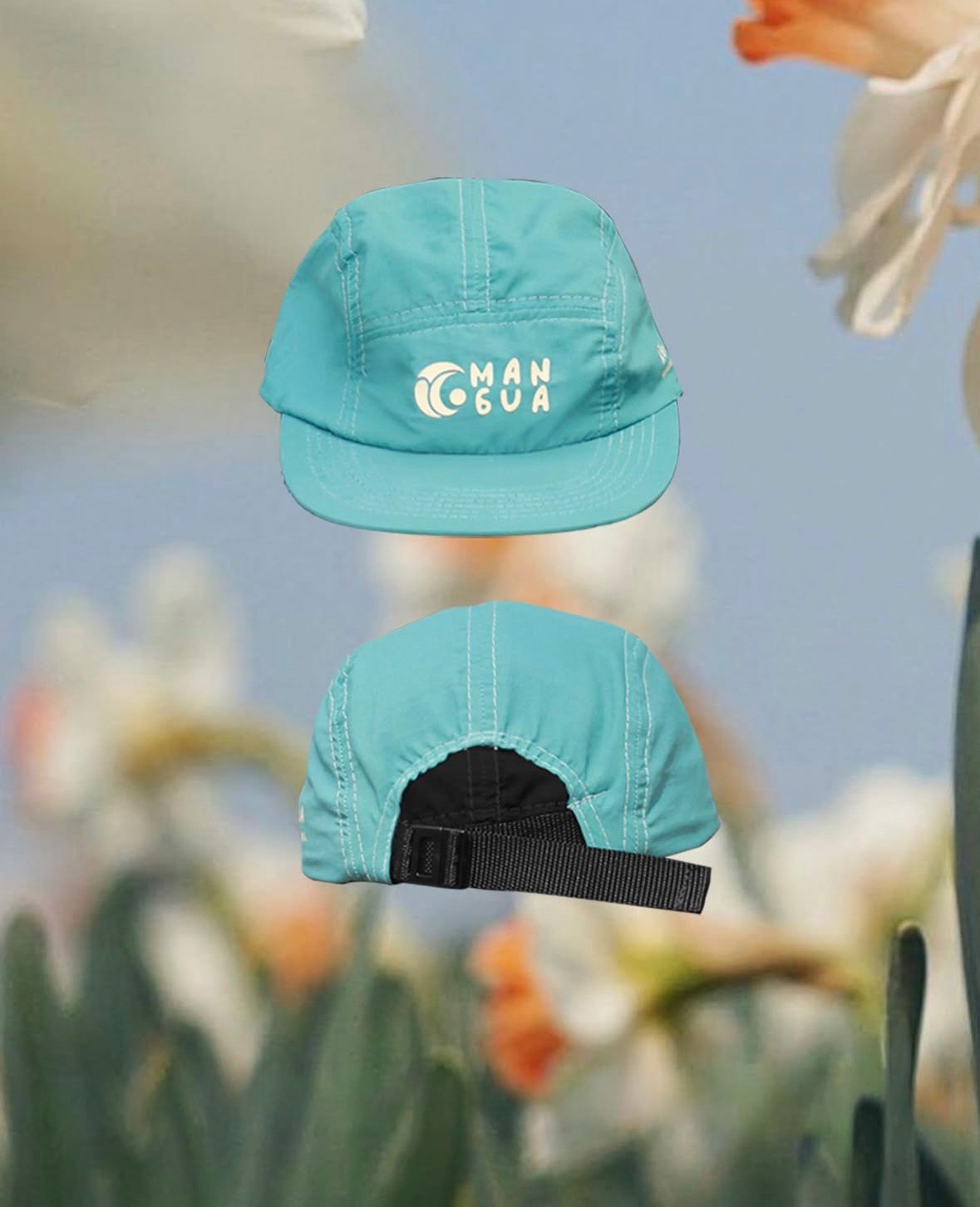 Gorra 5 paneles color pistacho, está hecha en tela microtec impermeable, tiene un broche ajustable atrás y el logo en el frente.